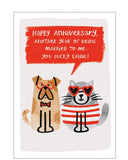 This cute anniversary card is decorated with a cartoon of a card and dog in heart-shaped sunglassess and stripey jumpers sitting side-by-side. A text box above the card reads "Happy Anniversary...another year of being married to me...you lucky thing!"