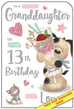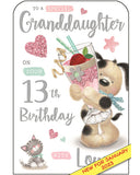 This 13th birthday card for a very special Granddaughter is decorated with a cute illustration of Fudge the dog holding a lovely strawberry milkshake. The text on the front of this Birthday card reads "To a Special Granddaughter on your 13th Birthday With love”