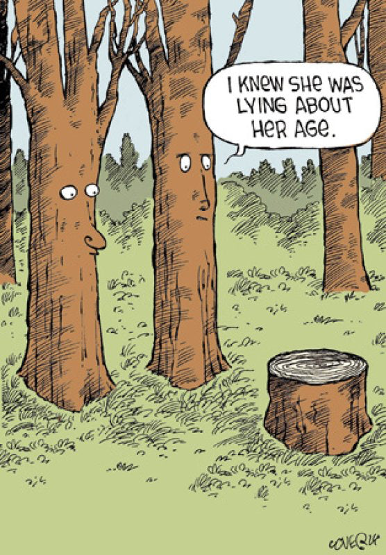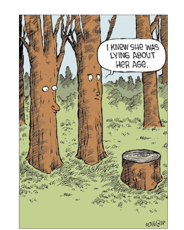 This blank card from Woodmansterne's Speed Bump range of comedy cards is decorated with a cartoon showing two trees looking at a stump - with its rings visible. One tree says "I knew she was lying about her age".