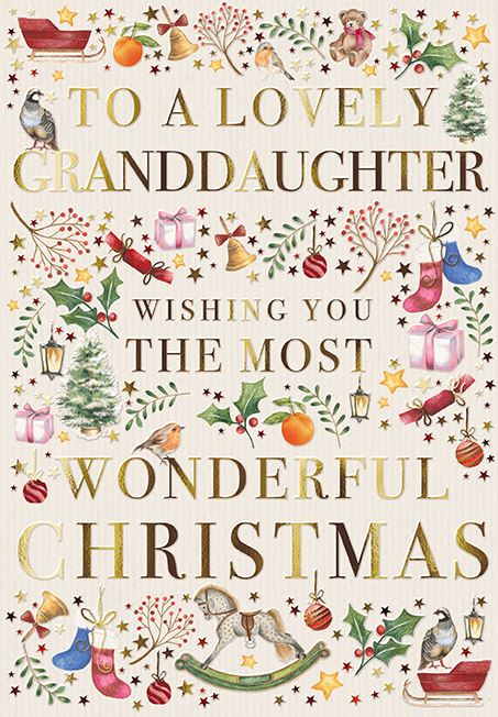Delight your granddaughter this festive season with this gorgeous Christmas card, bursting with holiday magic and heartfelt sentiment. The card is beautifully decorated with tiny detailed illustrations of festive icons, including sleighs, Christmas trees, presents, stockings, baubles, and toys, creating a joyful and nostalgic holiday scene. Bold gold text on the front reads "To a Lovely Granddaughter...Wishing You the Most Wonderful Christmas".