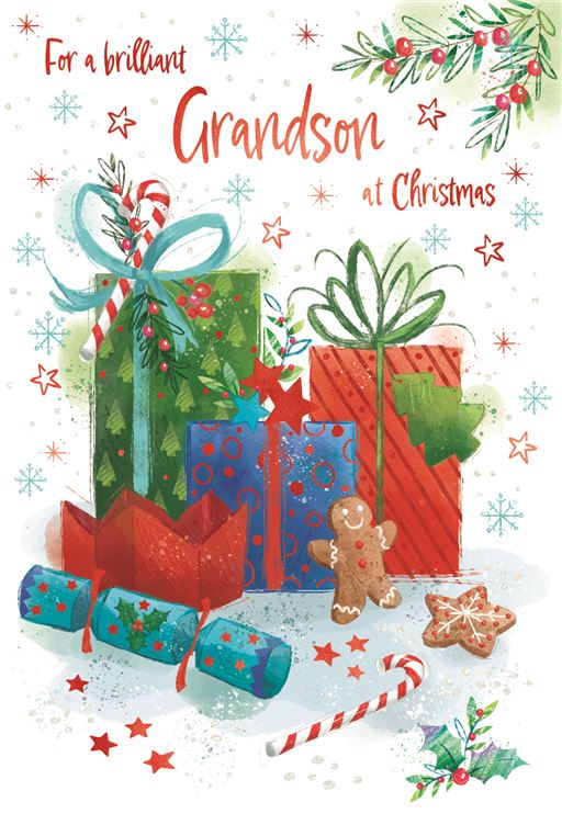 Modern, stylish Christmas card featuring wrapped presents "For a brilliant grandson at Christmas" but with a touch of whimsey with a gingerbread man.