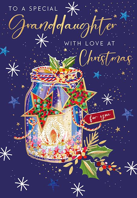 Send love to your special granddaughter this Christmas with this charming festive card. The design features a decorated candle in a jar, tied with a candy-cane ribbon and accented with sprigs of holly, set against a rich dark blue background. The heartfelt caption reads: “To a Special Granddaughter with love at Christmas”, making it the perfect seasonal greeting to show your love and festive cheer.