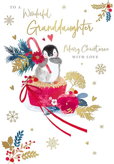 Delight your granddaughter this festive season with this adorable Christmas card for a special Granddaughter. The charming design features a sweet little penguin perched happily on top of a festive cupcake, surrounded by winter flowers and seasonal decorations.