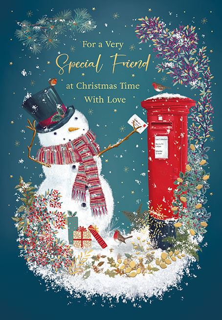 Send festive cheer to someone dear with this Christmas card for a very special friend. The charming design features a cheerful snowman posting his Christmas cards into a classic red postbox, set against a snowy blue background for a traditional winter feel. Finished with elegant gold text that reads: “For a Very Special Friend at Christmastime With Love”, this card is a heartfelt way to show how much your friendship means during the holiday season.