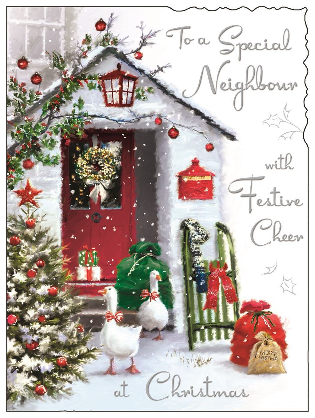 Spread Christmas joy with this delightful Jonny Javelin Christmas card. The charming snowy scene features a beautifully decorated house, a glowing Christmas tree, a sleigh, and a doorstep piled high with presents, while a friendly goose stops by to join the festive fun. Finished with sparkling silver text reading “To a Special Neighbour with Festive Cheer at Christmas”, this card perfectly captures the warmth and magic of a traditional holiday season. Ideal for sending heartfelt Christmas wishes to friends, neighbours, and loved ones.