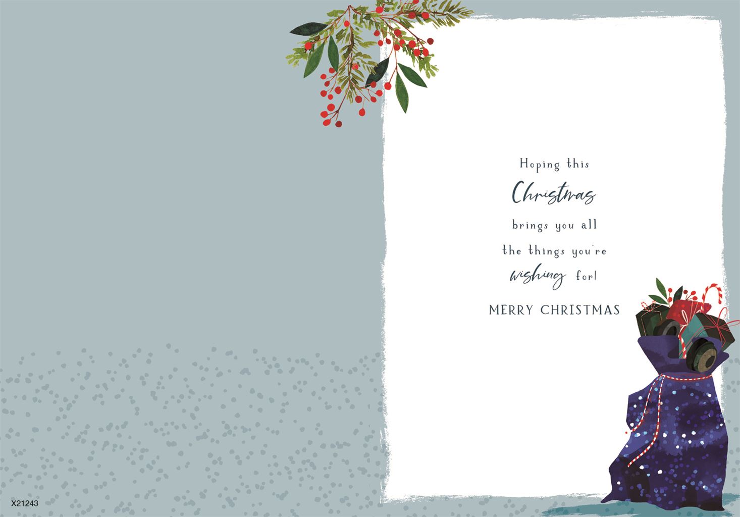 A football and lots of presents feature on this Christmas card "To an Amazing Nephew this Christmas". The colour tones are blues and gold.