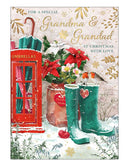 Send love and festive wishes with this beautifully illustrated Christmas card for a special Grandma and Grandad. The charming still-life artwork captures a cosy outdoor scene, featuring a pair of robins perched on green wellington boots, a bouquet of vibrant red poinsettia flowers in a vase, and umbrellas neatly stored in a quirky umbrella stand shaped like a classic red phone box.