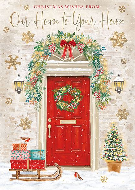 Celebrate the season with this charming Christmas card for special friends. The festive design features a classic red door decorated with a beautiful wreath and a garland draped over the fanlight. Beside the door sits a sleigh brimming with wrapped presents and a tiny Christmas tree, creating a warm and welcoming holiday scene. The heartfelt caption on the front reads: “Christmas Wishes from Our House to Your House”