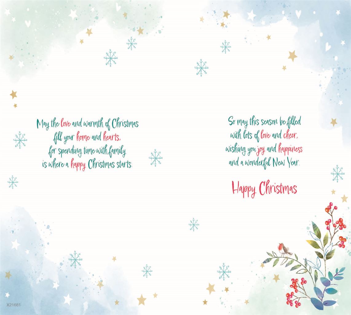 "May the love and warmth of Christmas fill your home and hearts, for spending time with family is where a happy christmas starts. So may this season be filled with lots of love and cheer, wishing you joy and happiness and a wonderful new year. Happy Christmas." |