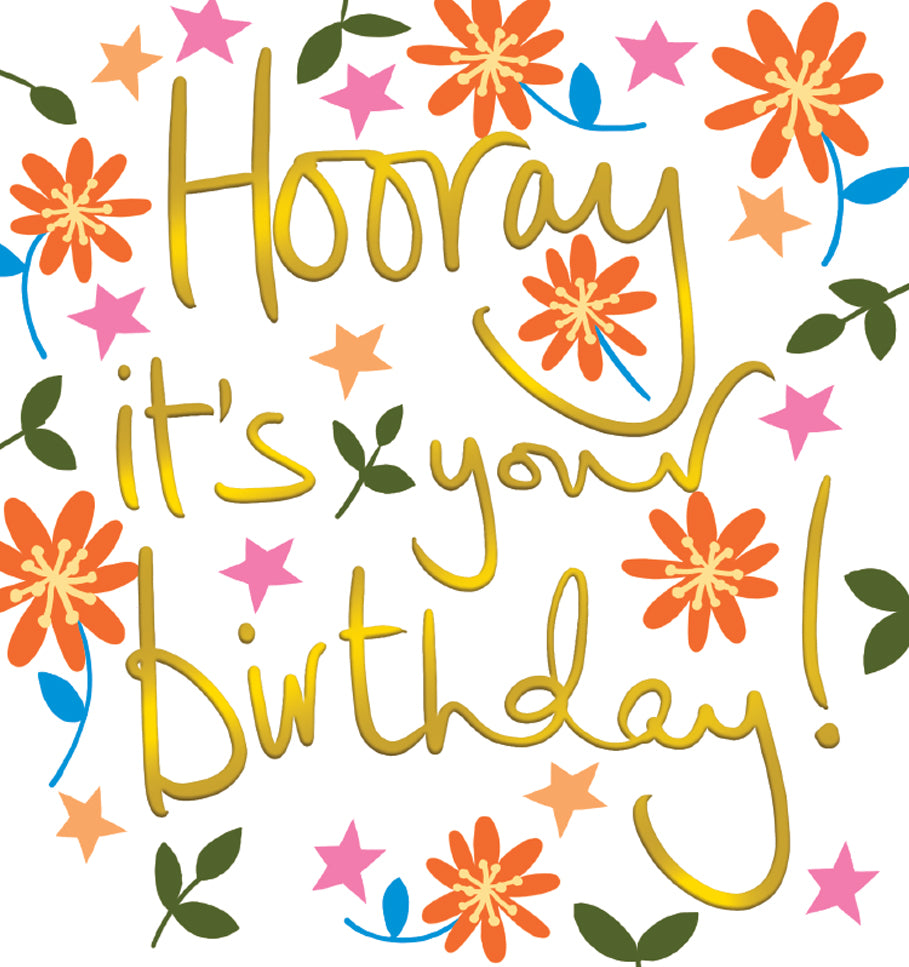 This bright and lovely birthday card is decorated with contemporary florals in gorgeous colours. Metallic gold text on the card reads "Hooray it's your birthday!"