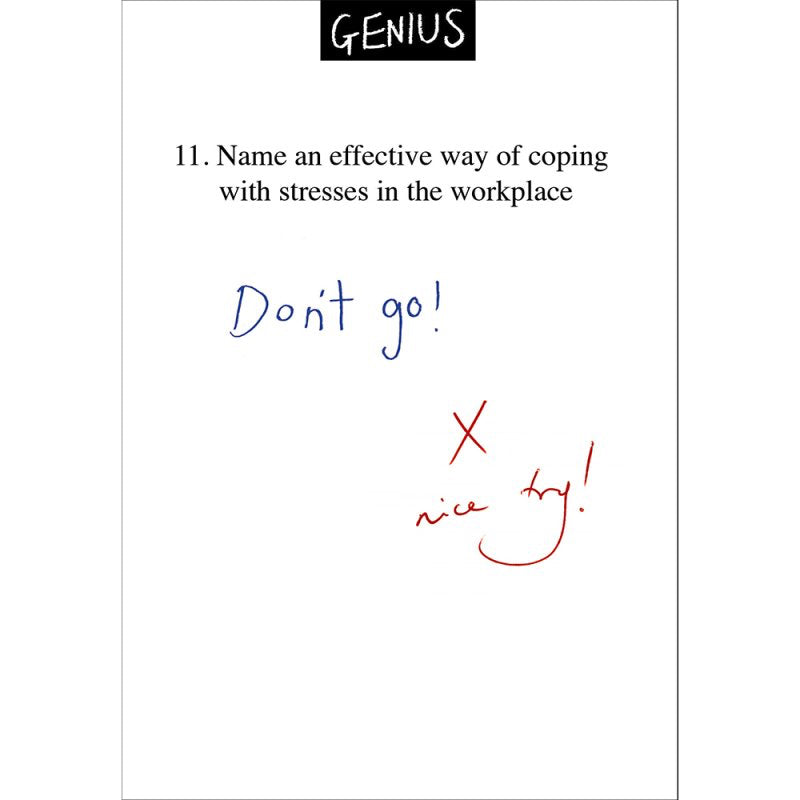 This funny card from Woodmansterne's Genius greetings card range is designed to look like an exam question - with a few differences! The exam question asks "Name an effective way of dealing with stress in the workplace" The handwritten answer reads "Don't go!".