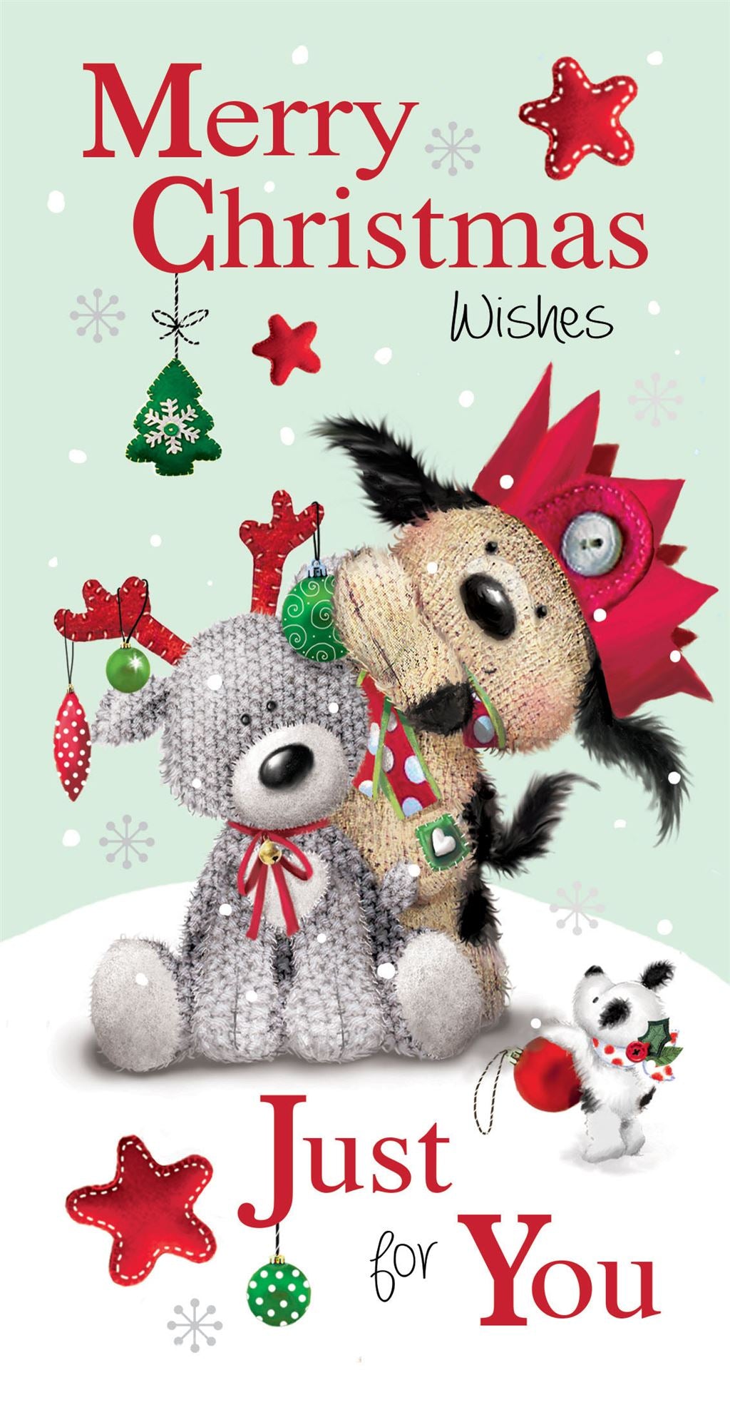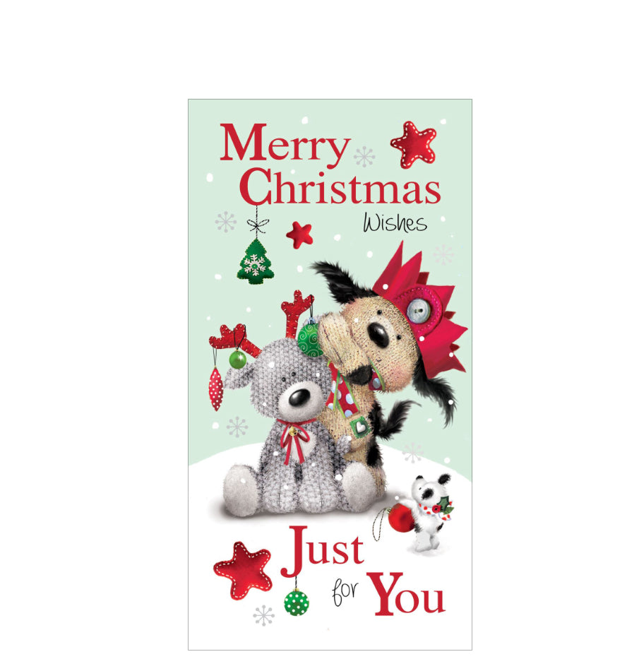 This money wallet is decorated with a cute illustration of Fudge the dog hanging baubles on the antlers of a cute knitted reindeer. The text on the front of the card reads "Merry Christmas Wishes Just For You".