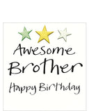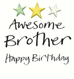 Black brush script on the front of this birthday card reads "Awesome Brother Happy Birthday" with three metallic stars above the text.