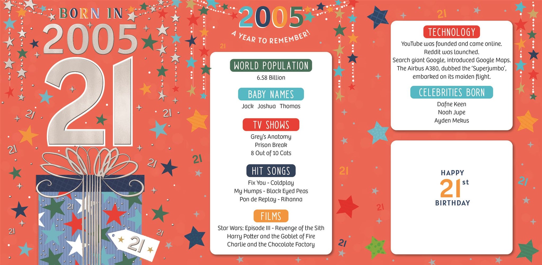 Relive the past and give a gift that's as unique as your loved one! These fantastic 21st birthday cards feature loads of interesting facts about the year 2005.