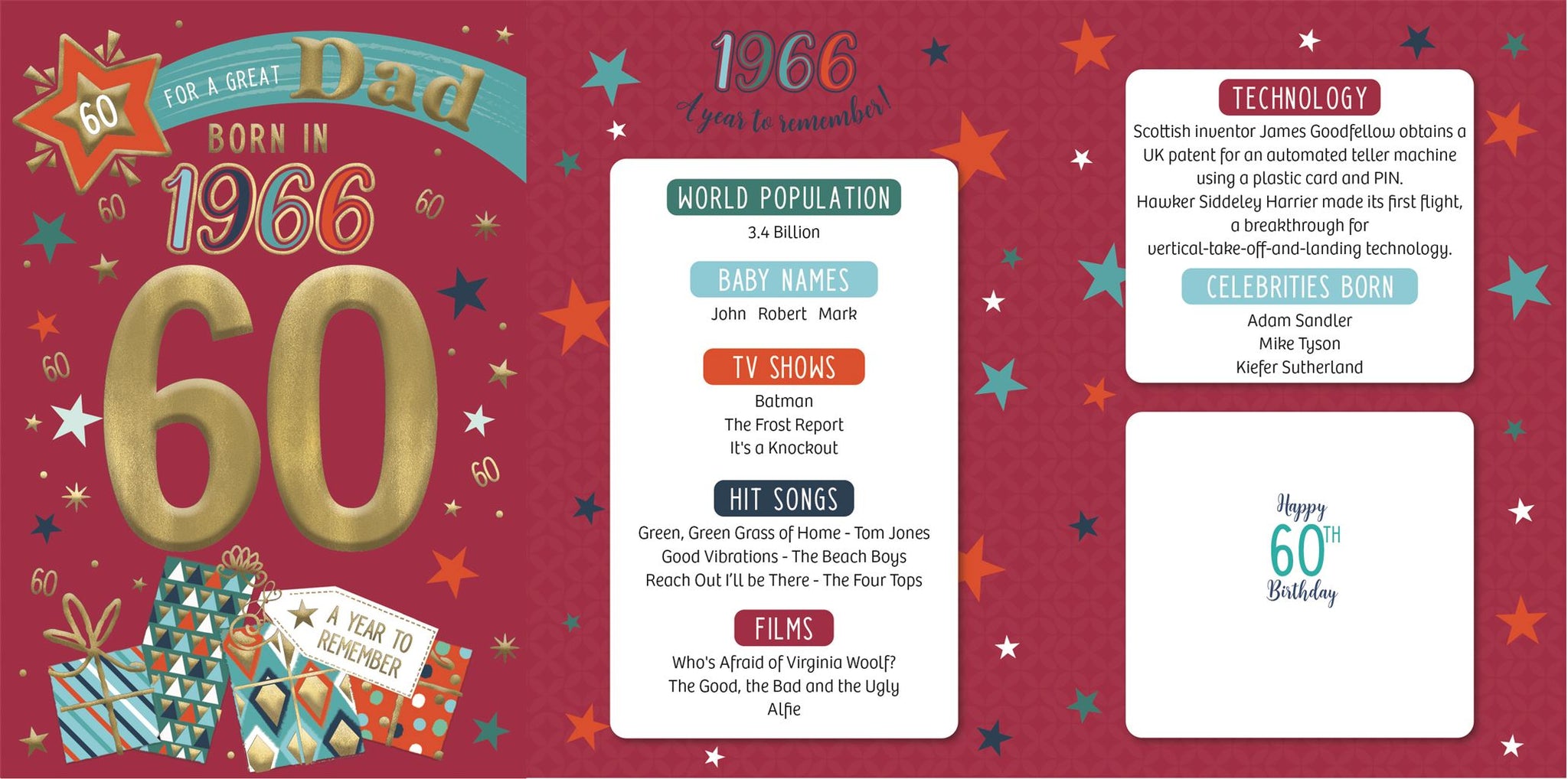 These fantastic 60th birthday cards feature loads of interesting facts about the year 1966 eg what were the new cars? Who won the FA cup?