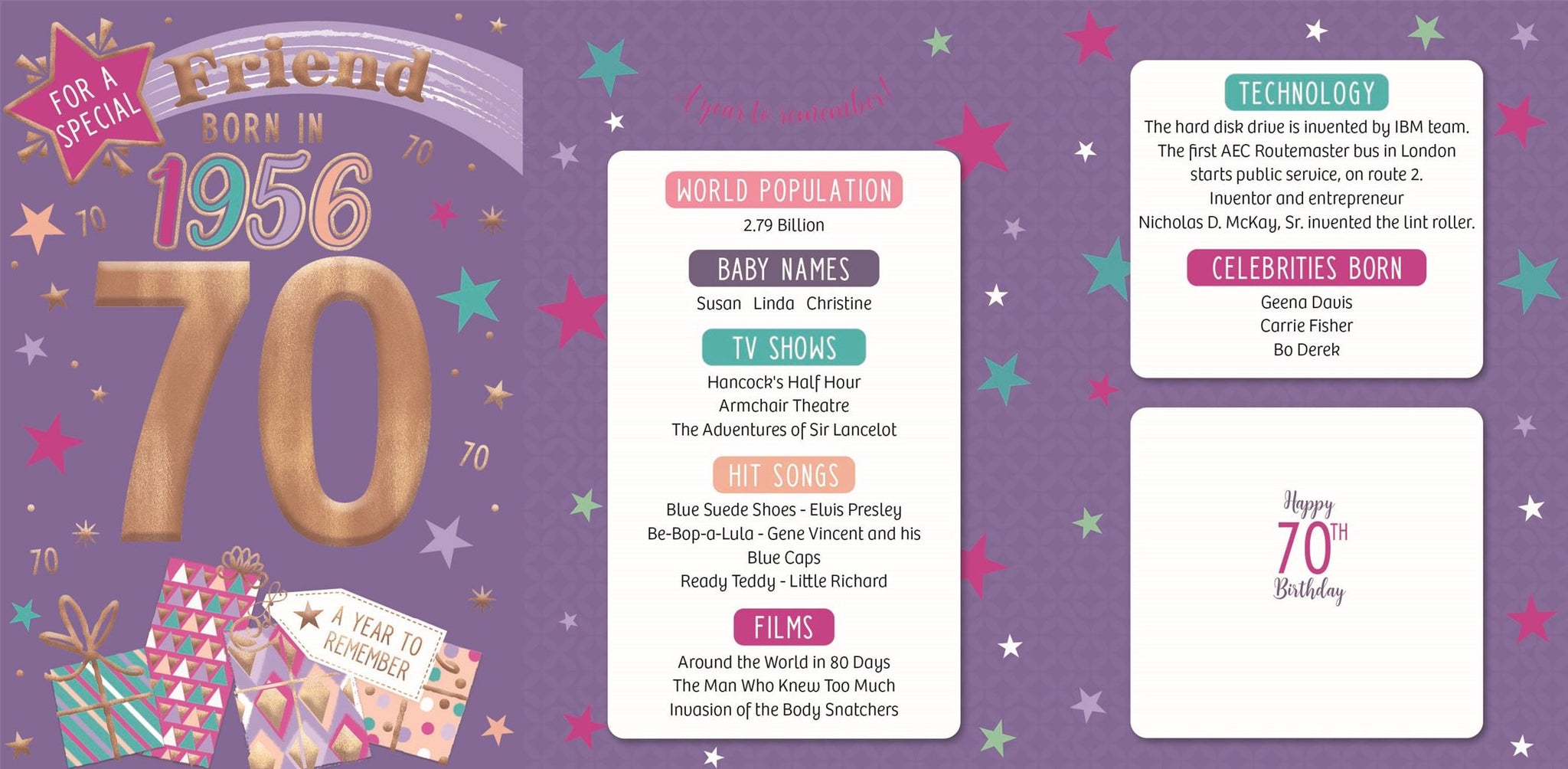 These fantastic 70th birthday cards feature loads of interesting facts about the year 1956.