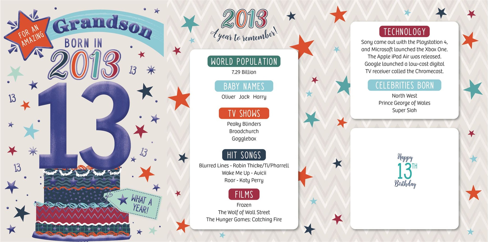Celebrate your grandson's special day with a gift that will take him back in time! This clever 13th birthday card features intriguing tidbits and factoids about the year he was born. Discover together the top hits, blockbuster films, and noteworthy events that made 2013 a year to remember. Show him that he's one of a kind with this charming and amusing 13th birthday card.