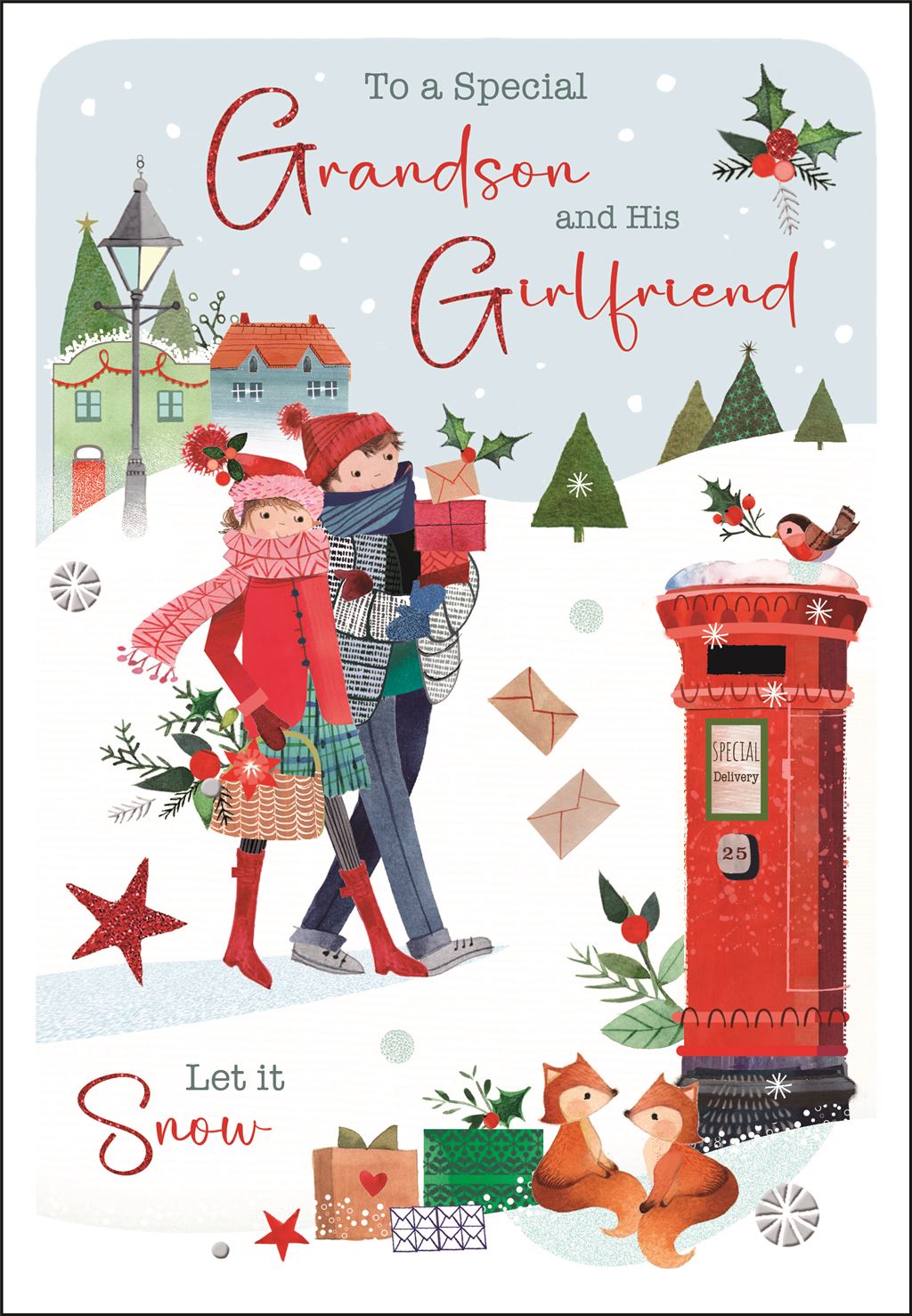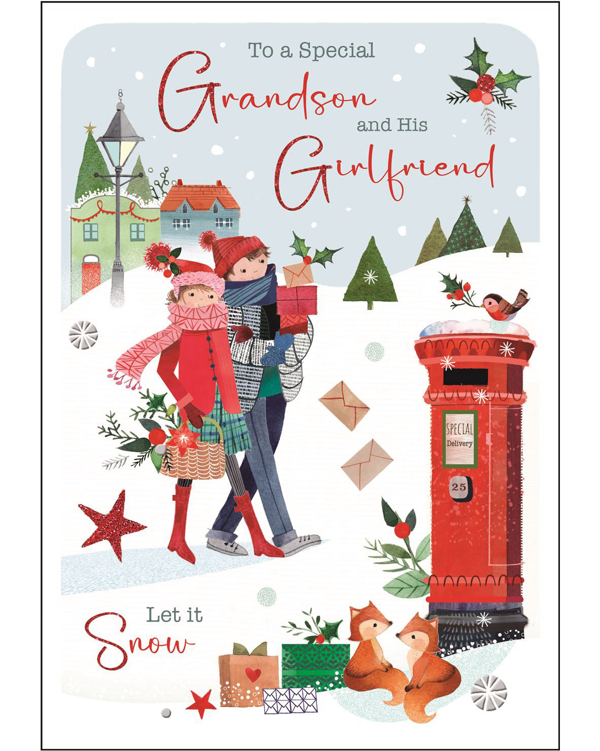 Send festive love and warm wishes with this beautifully illustrated Jonny Javelin Christmas card for a special Grandson and his Girlfriend. The charming winter scene shows a couple walking hand in hand through the snow with their faithful dog, carrying Christmas gifts and posting cards along the way. The front of the card is finished with the heartfelt caption “To a Special Grandson & Girlfriend… Let it Snow”, making it the perfect way to celebrate the season with two very special people.