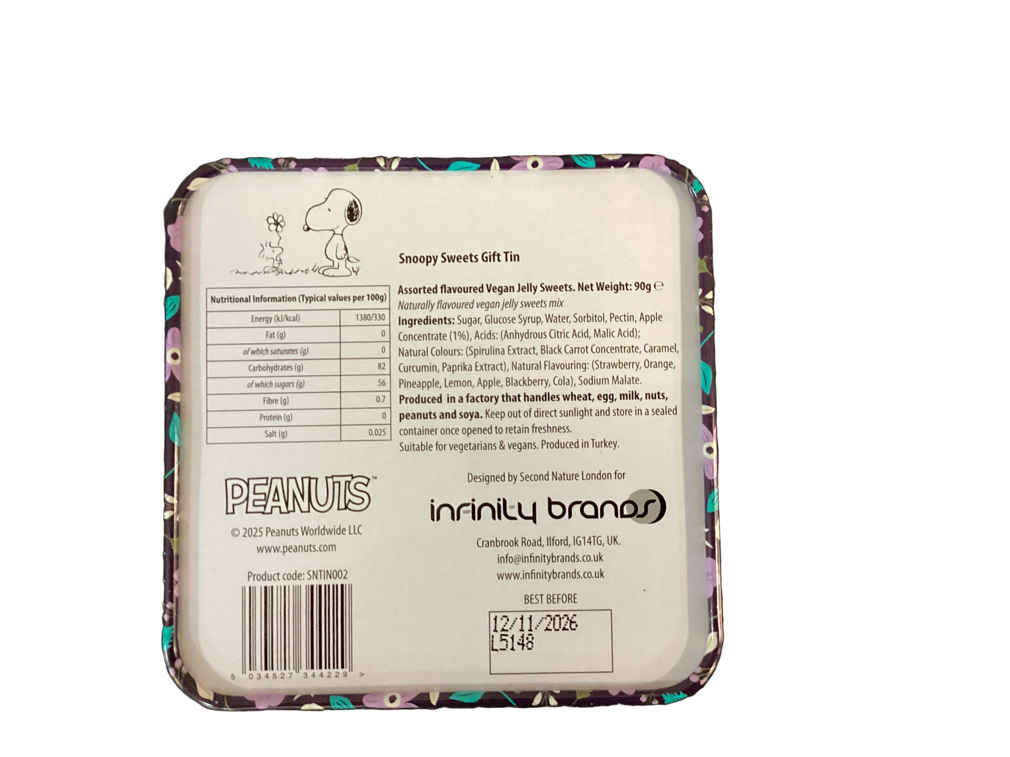 Small Keepsake tin featuring the much loved Snoopy from the Peanuts series, and filled with vegan jelly sweets. there are five to collect, and this one features Snoopy looking up at his friend who is resting within a large pink, flower