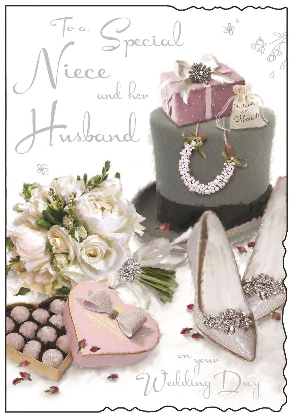 One of the Jonny javelin much loved Velvet range, this wedding card "For a Special Niece and her husband on your Wedding Day" features a top hat and luxury wedding shoes