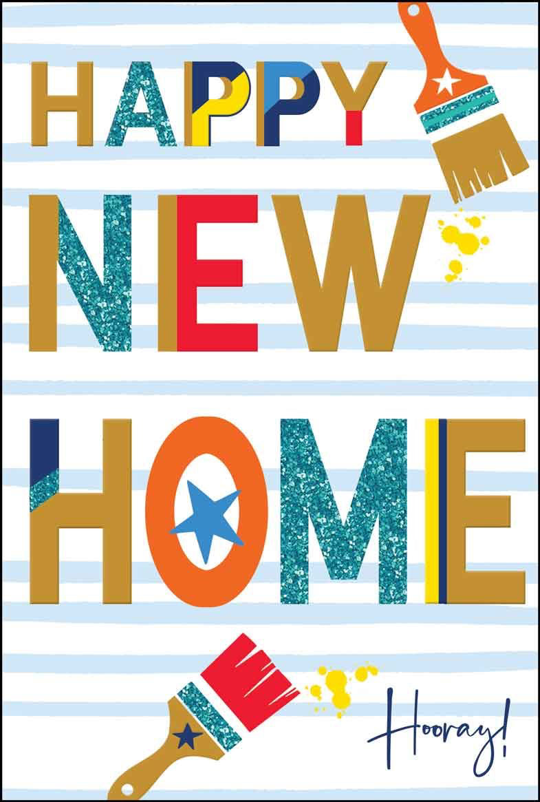 Celebrate a fresh start in style with this vibrant and modern New Home card. Featuring bold, colourful typography accented with metallic gold lettering, shimmering blue flitter, and two playful paintbrush illustrations, it’s the perfect way to mark the excitement of moving day. The cheerful front text reads: "Happy New Home Hooray!". A fun and energetic message for anyone settling into a new space.