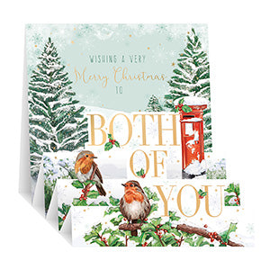 This Christmas card for both of you features a traditional festive snowy scene with robins and a red letterbox, Cover text reads "Wishing a very Merry christmas to both of you"