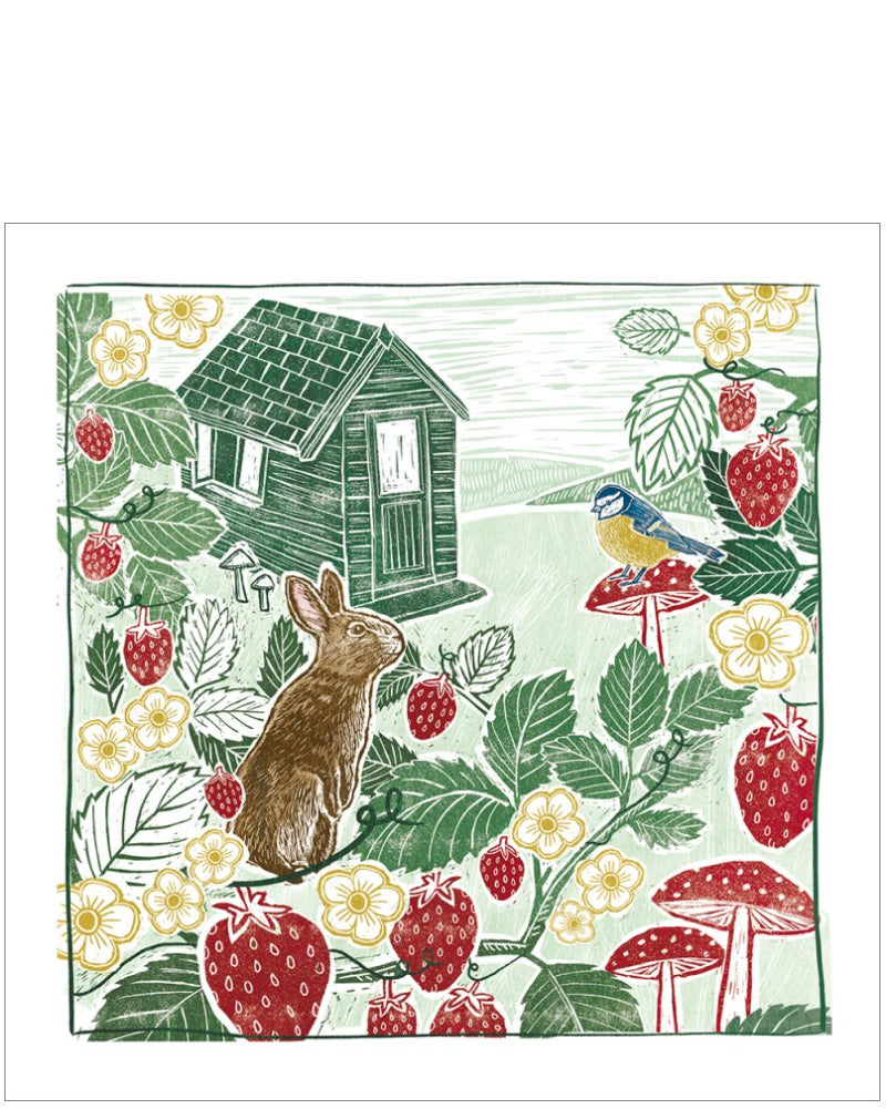 This stunning blank card from Oakpress features linoprint style illustration of a hare sitting amongst strawberry plants and looking at a bird. A garden shed sits in the background.