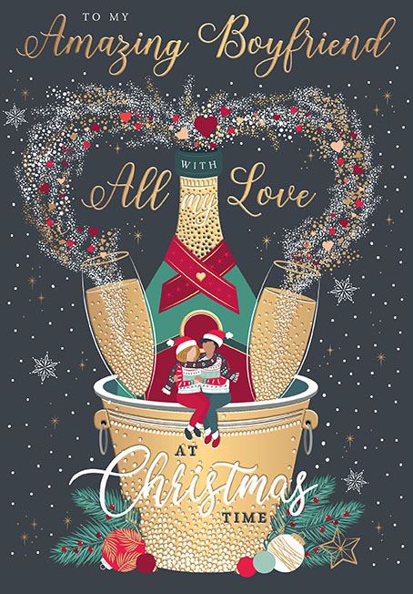 Celebrate love and the festive season with this stylish Christmas card for your amazing boyfriend. The elegant design features a champagne bottle topped with a golden hat, with two flutes filled from a flurry of golden hearts and winter foliage. Set against a rich dark background, the design is both modern and romantic – perfect for making him feel extra special.