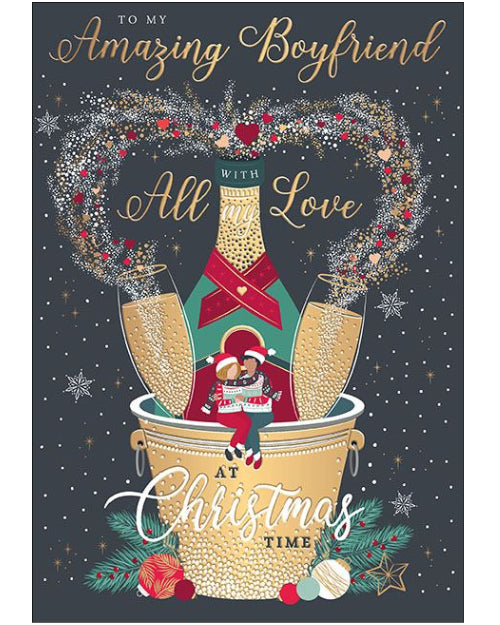 The card is finished with luxurious gold foil lettering, with the heartfelt message on the front reading: “To My Amazing Boyfriend With All My Love at Christmastime”.