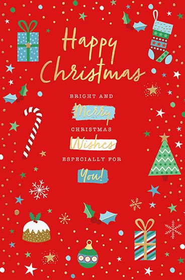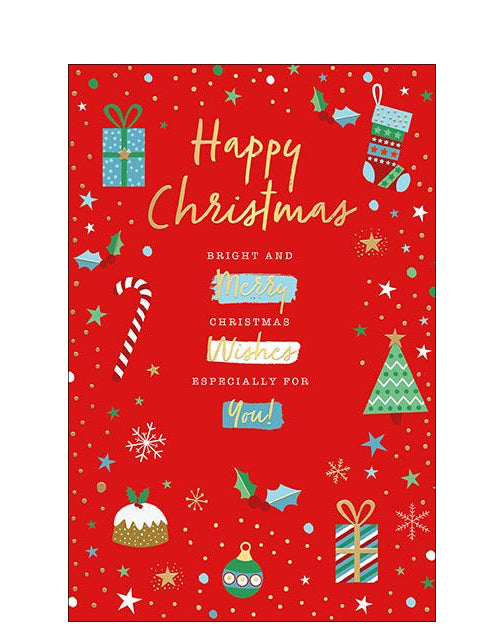 Send warm seasonal greetings with this beautifully designed red Christmas card featuring charming festive illustrations. The classic red background is adorned with Christmas motifs that capture the joy of the season, making it the perfect choice for spreading holiday cheer. The front of the card features a heartfelt caption in elegant lettering “Happy Christmas… bright and merry Christmas wishes especially for you.”