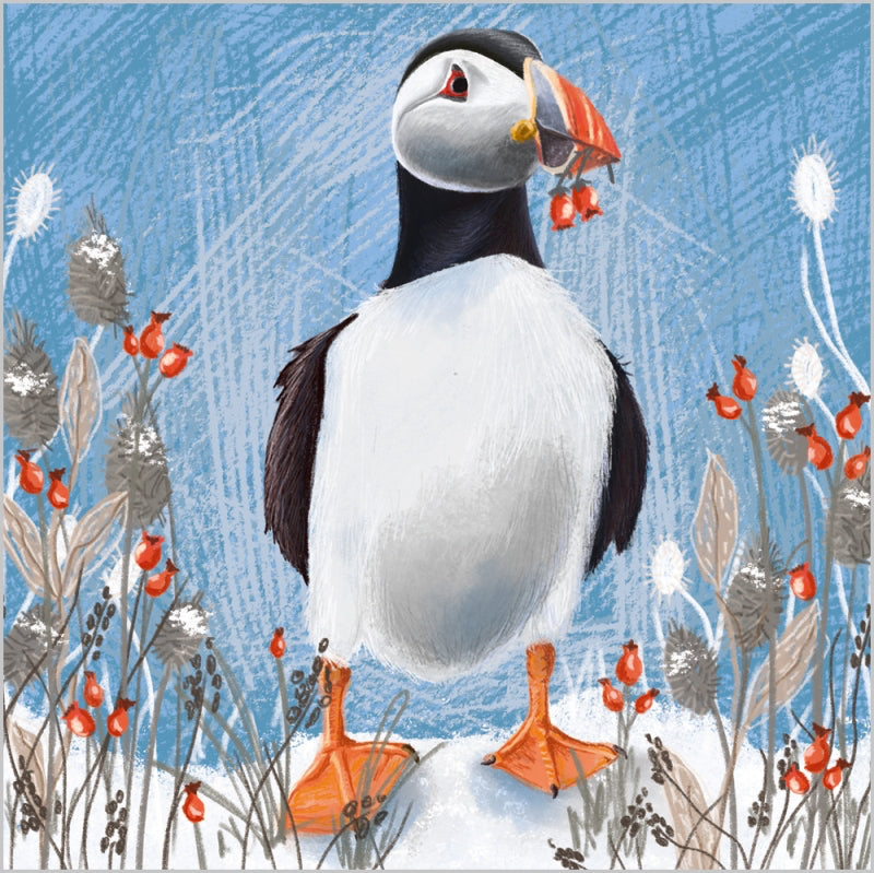 Spread festive cheer and support a good cause with this pack of 7 charity Christmas cards. Each card features a charming illustration of a puffin standing on a snowy beach with festive red berries in its beak.