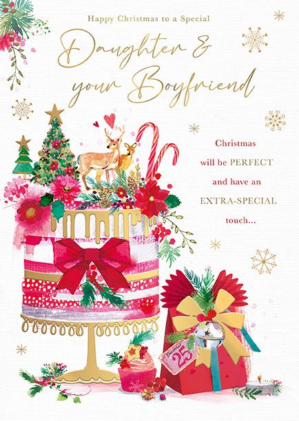 Celebrate the season with this beautifully designed Christmas card for a Daughter and her Boyfriend, perfect for sending love and festive cheer to a special couple. The charming illustration features a traditional Christmas cake decorated with holly, alongside beautifully wrapped presents in red, green, and gold – capturing the joy and warmth of the festive season. The caption on the front of the card reads "Happy Christmas to a Special Daughter & your Boyfriend...Christmas will be perfect and have an extra-special touch..."