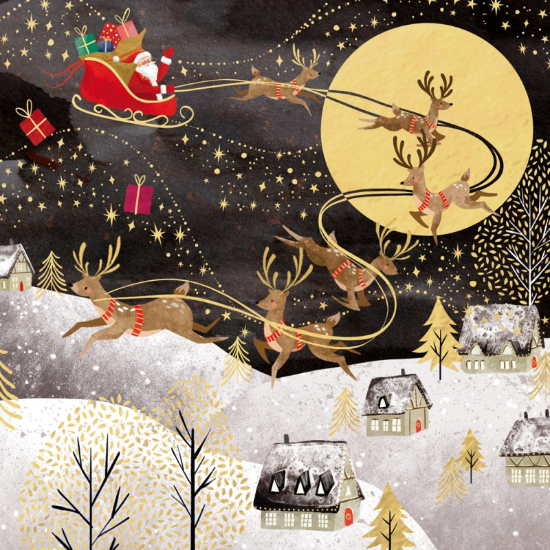 Bring festive cheer to your loved ones with this pack of 5 beautifully illustrated Christmas cards. Each card captures the magic of Christmas Eve, featuring Santa Claus in his sleigh pulled by reindeer, soaring across a starry night sky beneath a shimmering, gold full moon.