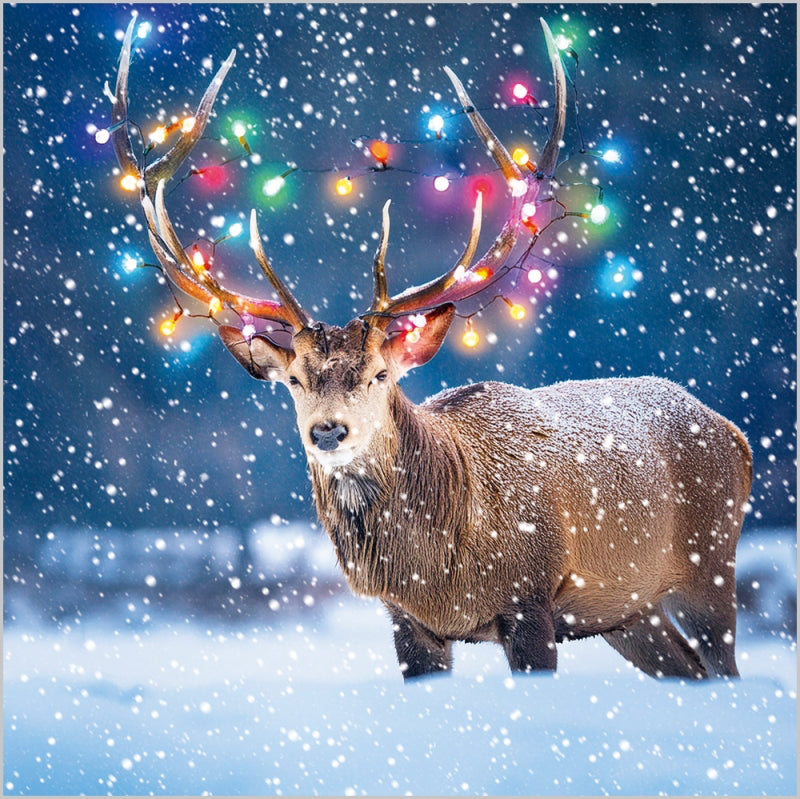 Spread festive cheer while supporting a good cause with this pack of 7 charity Christmas cards. Each card showcases a striking illustration of a majestic stag standing proudly in the snow, his antlers beautifully wrapped with colourful fairy lights. This magical winter design perfectly captures the spirit of Christmas with a touch of woodland charm.