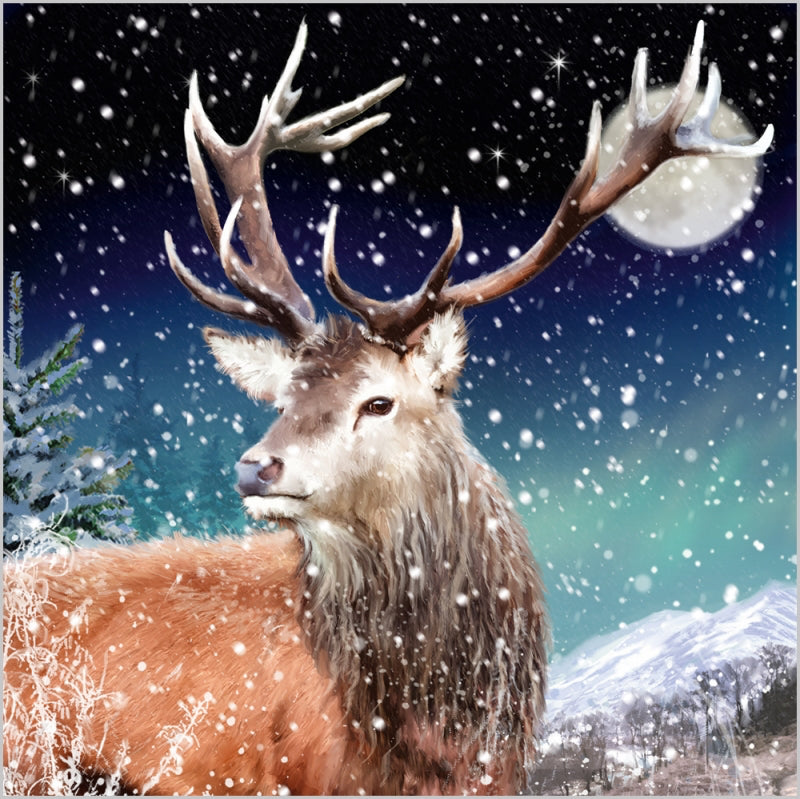 Spread festive cheer while supporting a good cause with this pack of 7 charity Christmas cards. Each card features a stunning illustration of a majestic stag standing proudly in a serene snowy landscape, illuminated by a glowing full moon in the background. This elegant winter scene captures the magic and tranquility of the festive season.