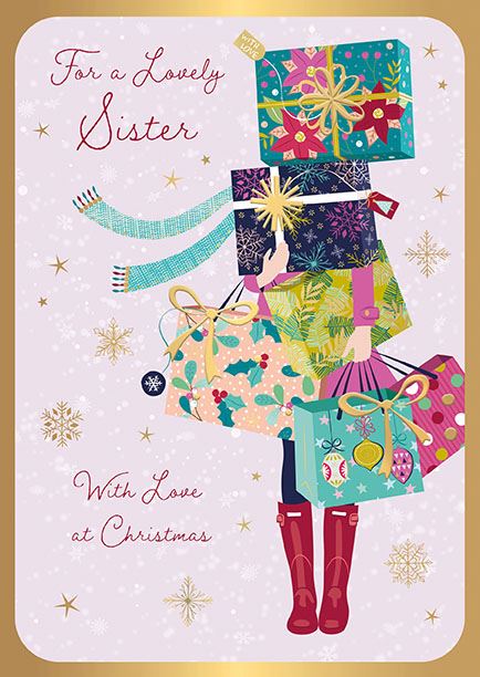 Delight your sister this festive season with this beautifully illustrated Christmas card featuring a fun and stylish design. The artwork shows a woman carrying a towering stack of colourful Christmas presents, with only her wellies, scarf, and hands peeking out from behind the gifts. Decorative festive elements and a shimmering gold border complete the cheerful look.