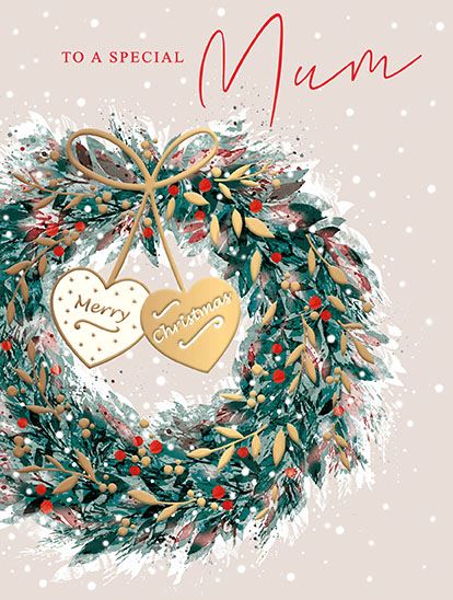 Send festive love and warm wishes with this elegant Christmas card for a special mum. The design features a beautiful wreath adorned with a pair of shimmering gold hearts that read "Merry Christmas", set against a soft beige background appled with Mum" making it a truly heartfelt choice for the season.