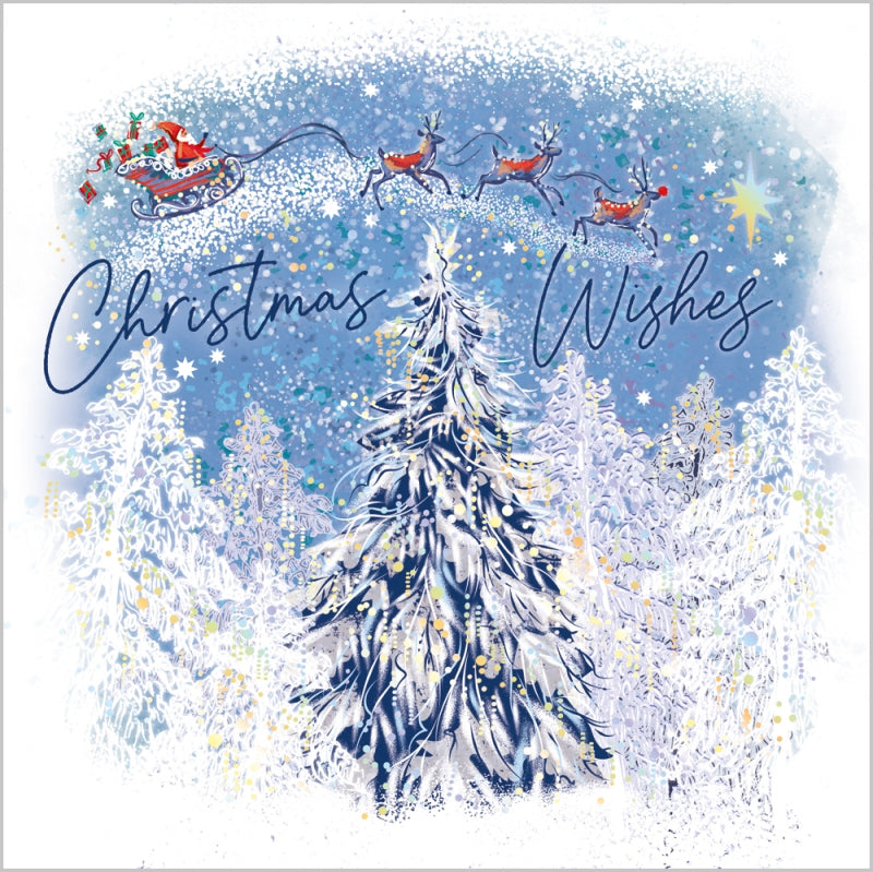 Bring Nordic charm to your holiday greetings with this pack of 5 beautifully illustrated Christmas cards. Each card features a captivating scene of Father Christmas in his sleigh, gliding gracefully through the night sky above a serene white and blue forest. The design is finished with stylish blue text that reads “Christmas Wishes”, adding a touch of seasonal warmth