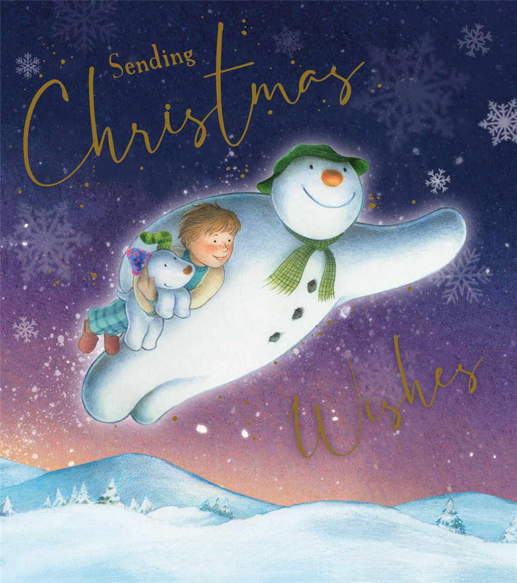 Capture the magic of Christmas with this officially licensed The Snowman Christmas greetings card, featuring enchanting artwork inspired by Raymond Briggs’ timeless classic. The illustration shows the Snowman in his iconic green woolly hat and scarf, flying through the Christmas Eve sky alongside James in his dressing gown and the playful Snowdog. The magical scene is beautifully finished with elegant gold text on the front that reads “Sending Christmas Wishes”.