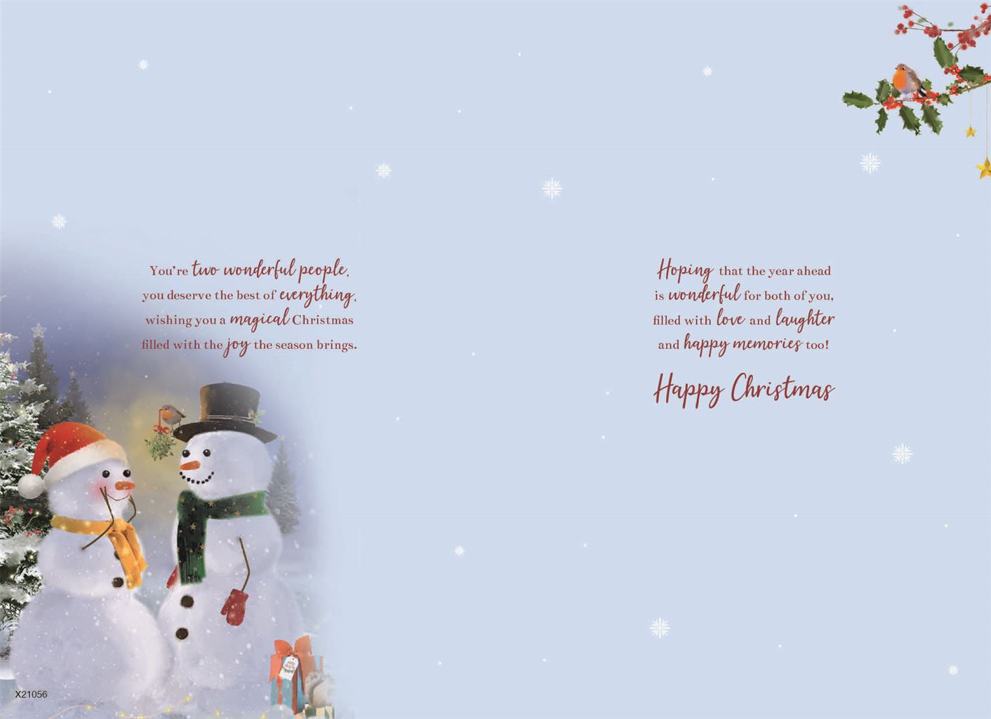 "You’re two wonderful people, You deserve the best of everything, Wishing you a magical Christmas Filled with the joy the season brings. Hoping that the year ahead Is wonderful for both of you, Filled with love and laughter And happy memories too! Happy Christmas" |