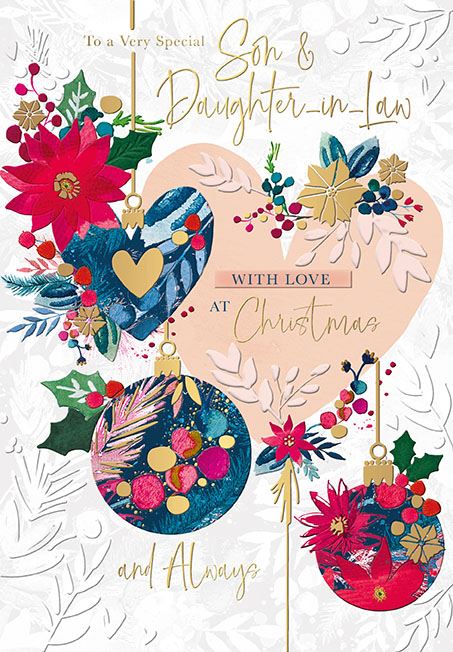 Celebrate the season with this elegant Christmas card for a special Son and Daughter-in-Law. The design features a soft peach heart surrounded by jewel-toned Christmas baubles in rich festive colours, creating a warm and stylish seasonal look. The card is finished with a heartfelt caption on the front: “To a Very Special Son & Daughter-in-Law…with Love at Christmas and Always”, making it the perfect way to show your love and festive wishes.