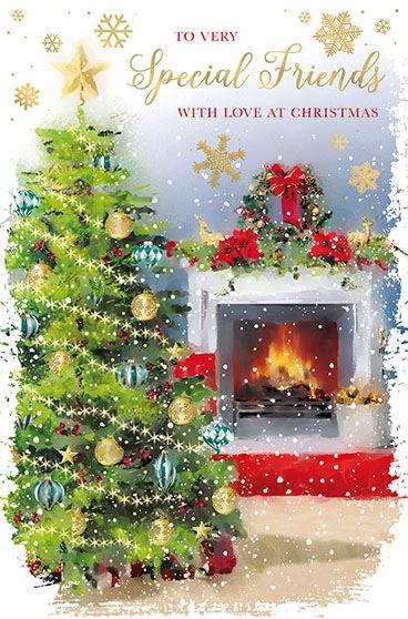 Celebrate friendship this festive season with this beautifully illustrated Christmas card for special friends. The design captures the warmth of a cosy living room at Christmastime, complete with a glowing fireplace, twinkling Christmas tree, and festive decorations that create a homely, welcoming feel. The heartfelt front caption reads: “To Very Special Friends With Love at Christmas”.