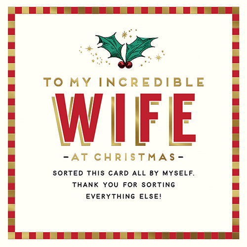Make her smile this festive season with this witty and heartfelt Christmas card for a special wife. The design features a luxurious red and gold border framing embossed text that reads: “To my incredible Wife at Christmas… sorted this card all by myself. Thank you for sorting everything else!”