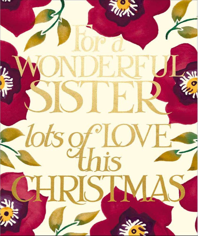 This beautiful Christmas card for a special sister is decorated in Emma Bridgewater's inimitable style, with rich red flowers and green foliage surrounding embossed gold text that reads "For a wonderful Sister lots of love this Christmas".